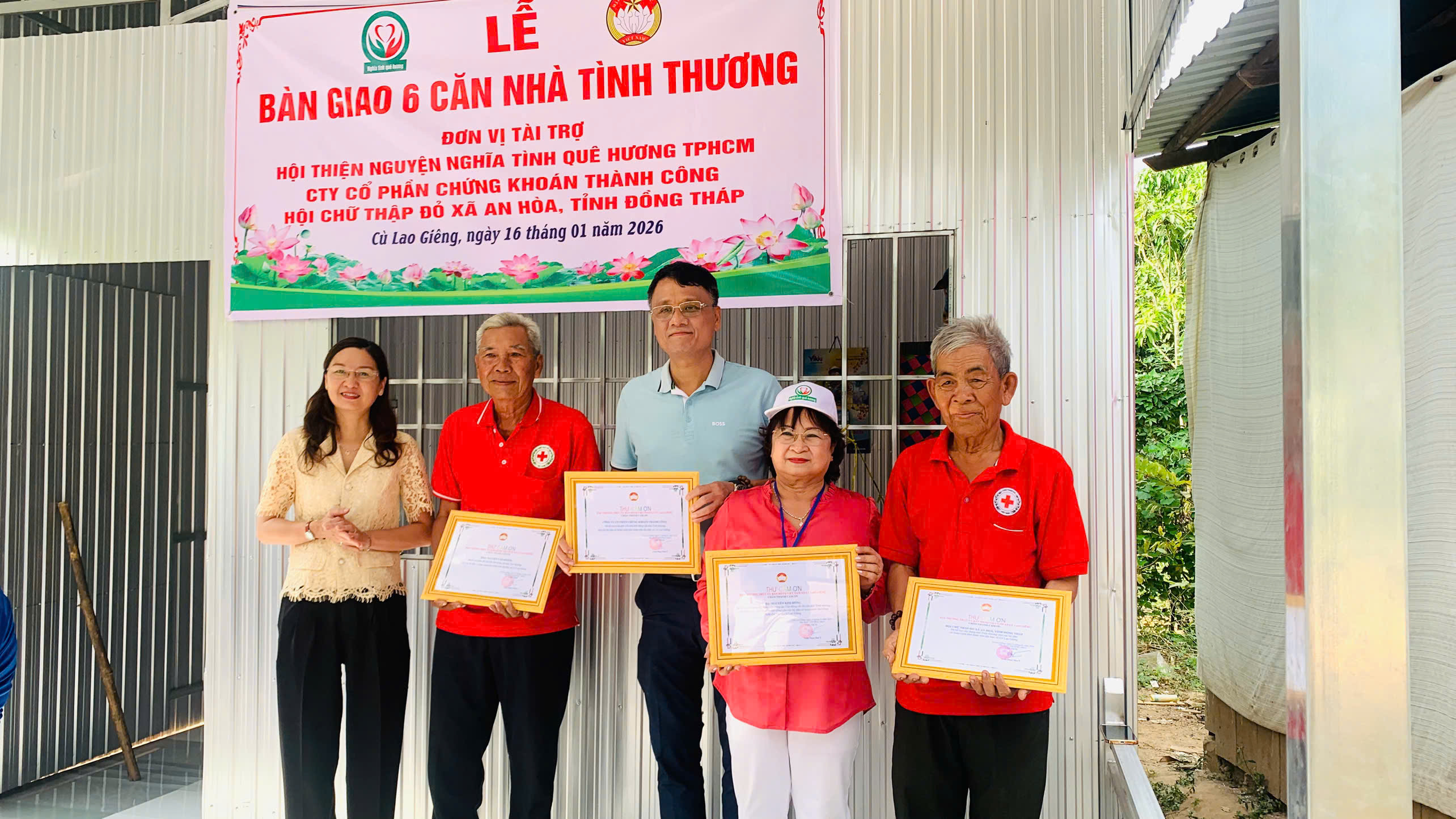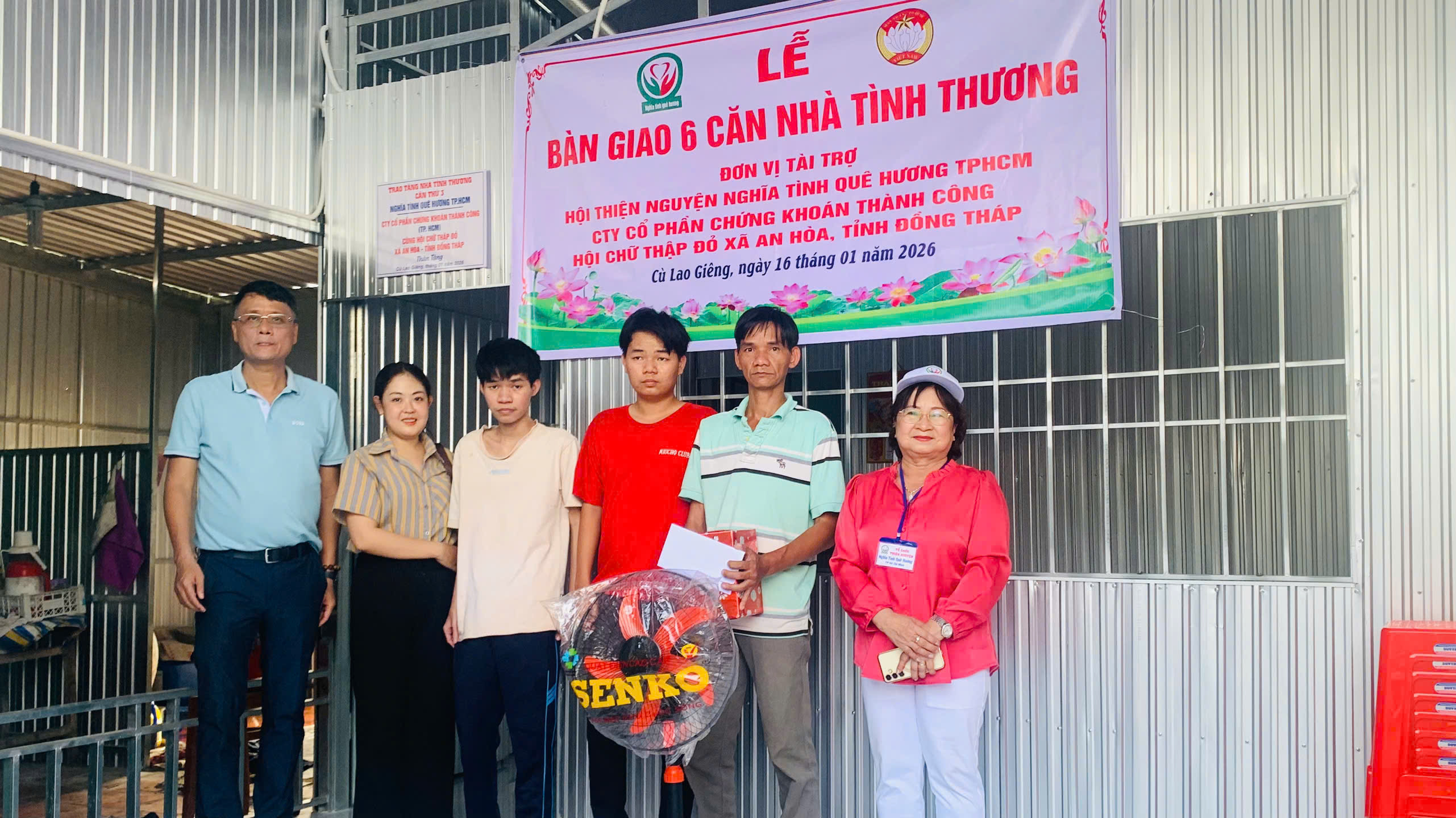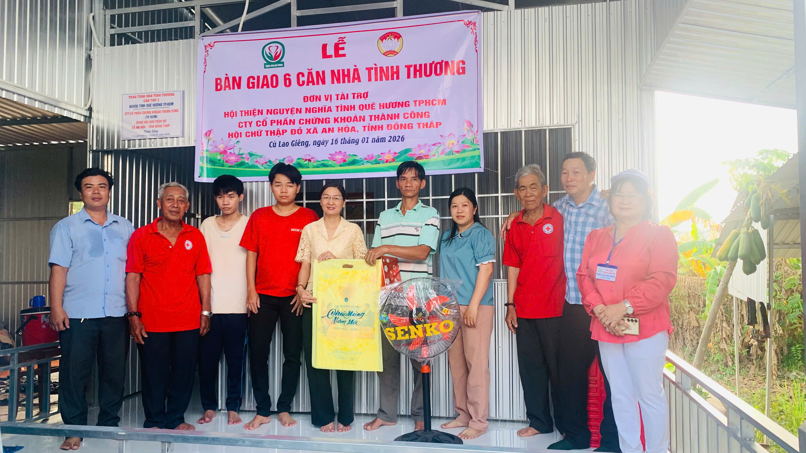 6 căn nhà bàn giao xây dựng có kết cấu mái lợp tôn, nền lát gạch bông và có nhà tiêu vệ sinh do Hội Chữ thập đỏ xã An Hoà, tỉnh Đồng Tháp thực hiện. Kinh phí thực hiện 6 căn nhà do Hội thiện nguyện Nghĩa tình quê hương (thành phố Hồ Chí Minh) kết nối Công ty Cổ phần chứng khoán Thành Công hỗ trợ 120 triệu đồng (mỗi căn 20 triệu đồng), phần còn lại do gia đình và ban ấp vận động đối ứng.