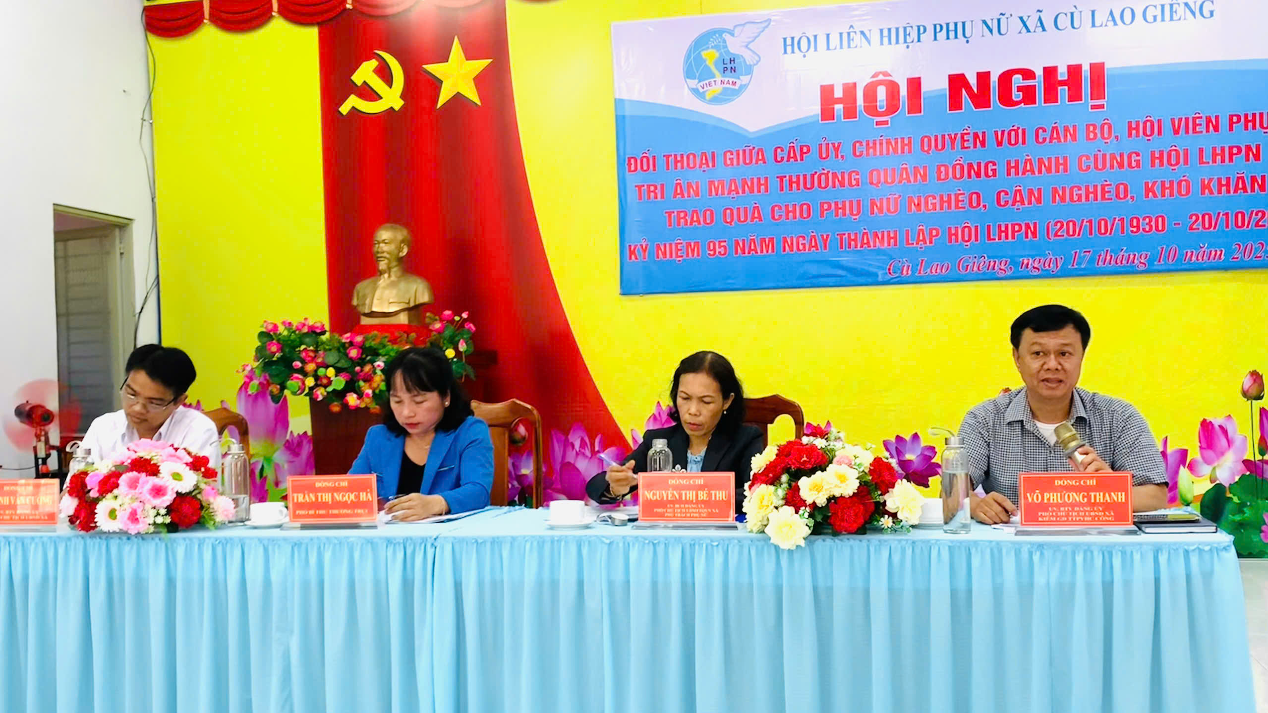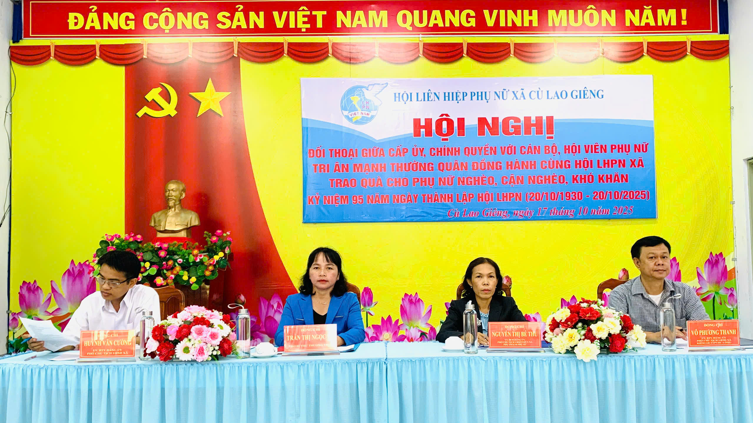 Nhân dịp kỷ niệm 95 năm ngày thành lập Hội Liên hiệp Phụ nữ Việt Nam (20/10/1930 - 20/10/2025), sáng ngày 17/10/2025, Hội LHPN xã Cù Lao Giêng (tỉnh An Giang) tổ chức đối thoại giữa cấp ủy Đảng, chính quyền với Hội viên phụ nữ, tri ân mạnh thường quân đồng hành cùng Hội và trao quà cho phụ nữ nghèo, cận nghèo, khó khăn trên địa bàn. Tham dự có đồng chí Trần Thị Ngọc Hà - Phó Bí Thường trực Đảng ủy, bà Trần Phan Như Ý - Chủ tịch Ủy ban MTTQ Việt Nam xã, ông Huỳnh Văn Cường – Phó Chủ tịch UBND xã, ông Võ Phương Thanh – Phó Chủ tịch UBND xã, cùng các đồng chí đại diện lãnh đạo các ban ngành đoàn thể xã, Chủ tịch hội Phụ nữ xã qua các thời kỳ, Bí thư chi bộ, Chi hội trưởng, chi hội phó Hội Phụ nữ các ấp và 110 hội viên, phụ nữ tiêu biểu.