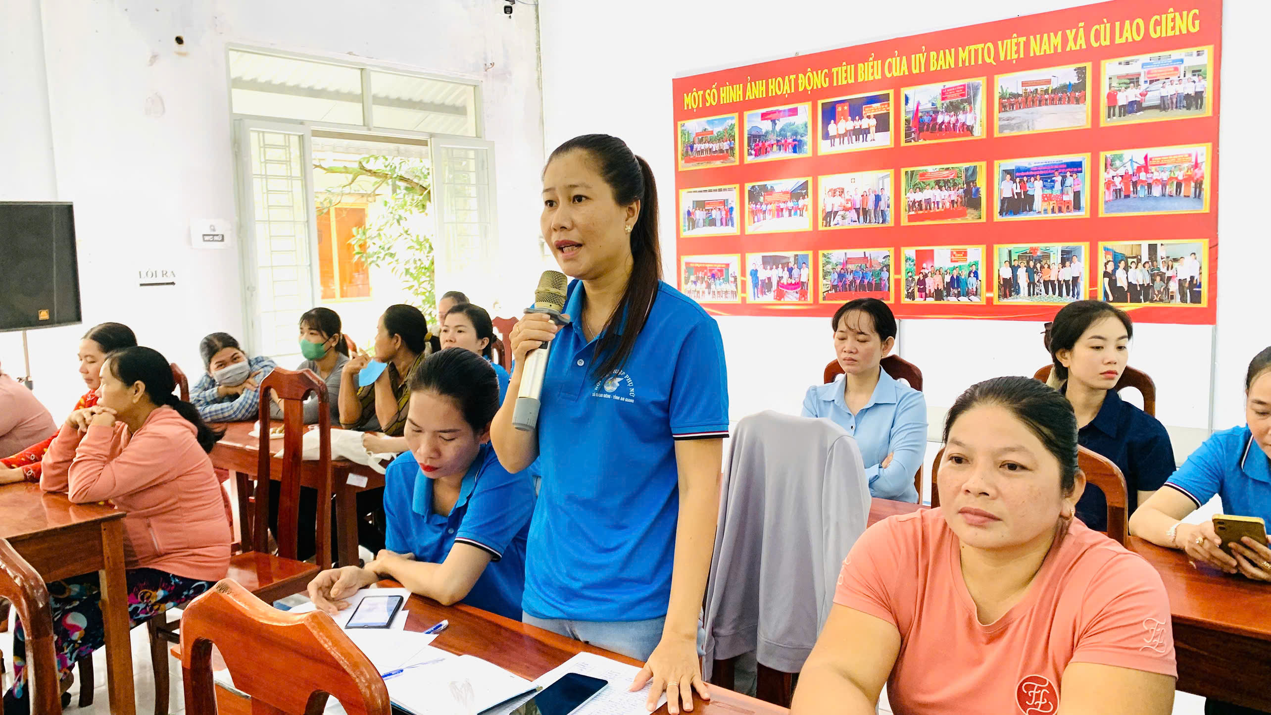 Tại hội nghị, Chủ tịch Hội LHPN xã Nguyễn Thị Bé Thu đã thông tin khái quát kết quả thực hiện nhiệm vụ công tác Hội và phong trào phụ nữ thời gian qua, đặc biệt là sau khi xã Cù Lao Giêng thực hiện sáp nhập đơn vị hành chính. Với tinh thần: “Dân chủ- cởi mở- thẳng thắn - xây dựng”, tại hội nghị đã ghi nhận 18 câu hỏi, ý kiến, kiến nghị của hội viên phụ nữ xoay quanh về chăm sóc sức khỏe và nâng cao kiến thức cho phụ nữ, phát triển kinh tế, học nghề và tiếp cận vốn vay, tuyên truyền chính sách và nâng cao kỹ năng số, chính sách trợ cấp xã hội, an sinh và thủ tục hành chính, an ninh trật tự, cụ thể: UBND xã cần có kế hoạch tổ chức các lớp tập huấn, sinh hoạt chuyên đề về chăm sóc sức khỏe sinh sản, kỹ năng nuôi dạy con, xây dựng gia đình hạnh phúc và phòng chống bạo lực gia đình; Ngành Y tế có kế hoạch tổ chức khám sức khỏe định kỳ, tầm soát các bệnh phụ khoa, tuyên truyền phòng bệnh và hướng dẫn điều trị hiệu quả cho phụ nữ; Cần có kế hoạch tập huấn kỹ năng số cơ bản cho hội viên; UBND xã có kế hoạch hỗ trợ kết nối đầu ra, tiêu thụ các sản phẩm nông nghiệp chủ lực (Xoài) để giúp nông dân ổn định thu nhập; Chính sách nào hỗ trợ cho các trường hợp người già neo đơn, bệnh tật, không lao động được nhưng chưa đủ tuổi hưởng chế độ người cao tuổi; Đề nghị UBND có buổi tuyên truyền cho người dân nắm về kỹ năng thao tác các thủ tục hành chính trên dịch vụ công trực tuyến; Chính quyền có giải pháp gì để ngăn chặn tình trạng trộm cắp vặt ở các tuyến nội đồng, bảo vệ tài sản của người dân; Hiện tại học sinh trên địa bàn sử dụng xe điện đến trường rất nhiều và xảy ra một số trường hợp gây tai nạn nguy hiểm, vì vậy ngành chức năng có biện pháp đối với xe điện hay không?... Các ý kiến, kiến nghị và đề xuất của hội viên phụ nữ đã được lãnh đạo cấp ủy Đảng, chính quyền ghi nhận và trả lời thỏa đáng tại buổi đối thoại.