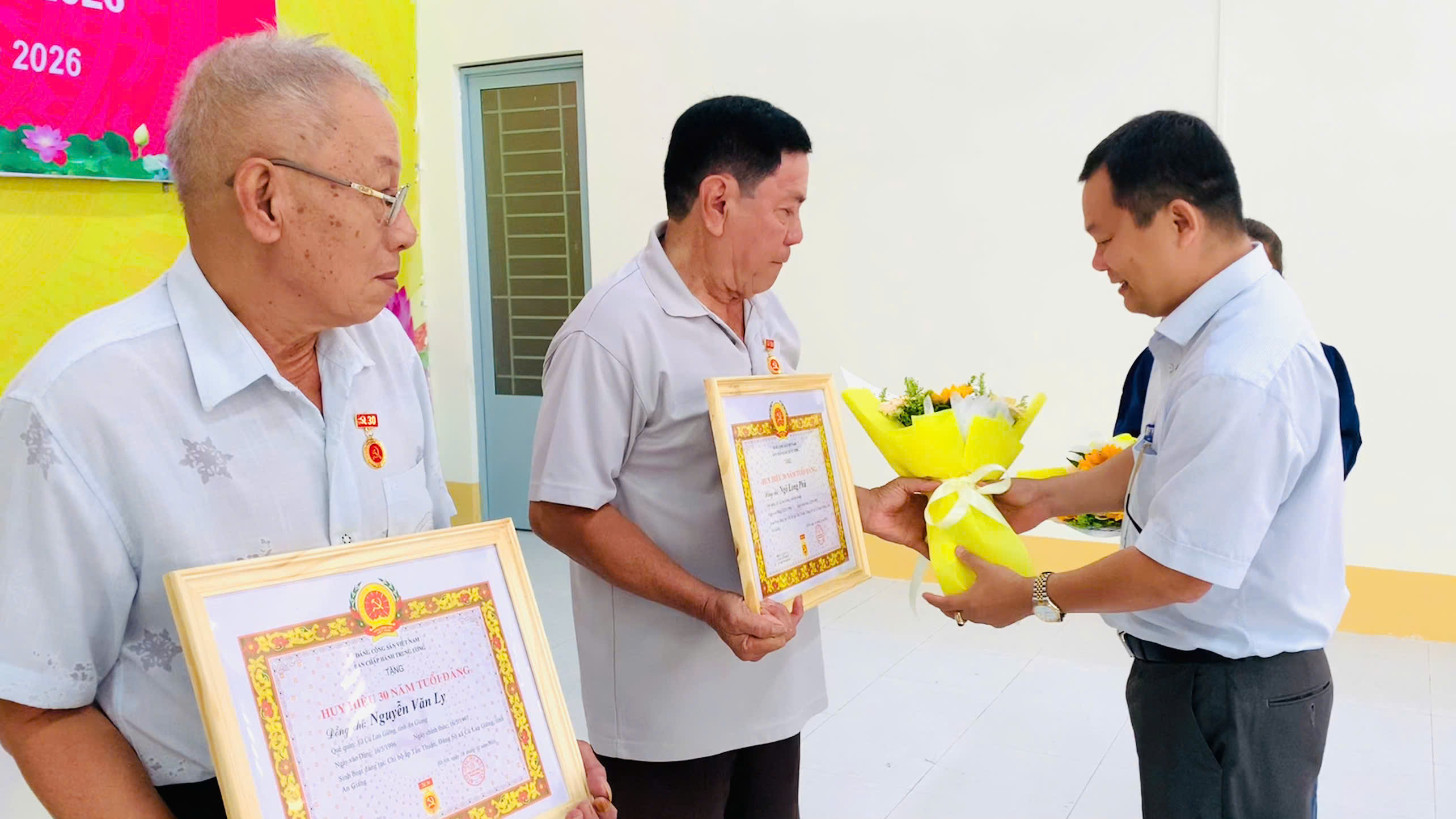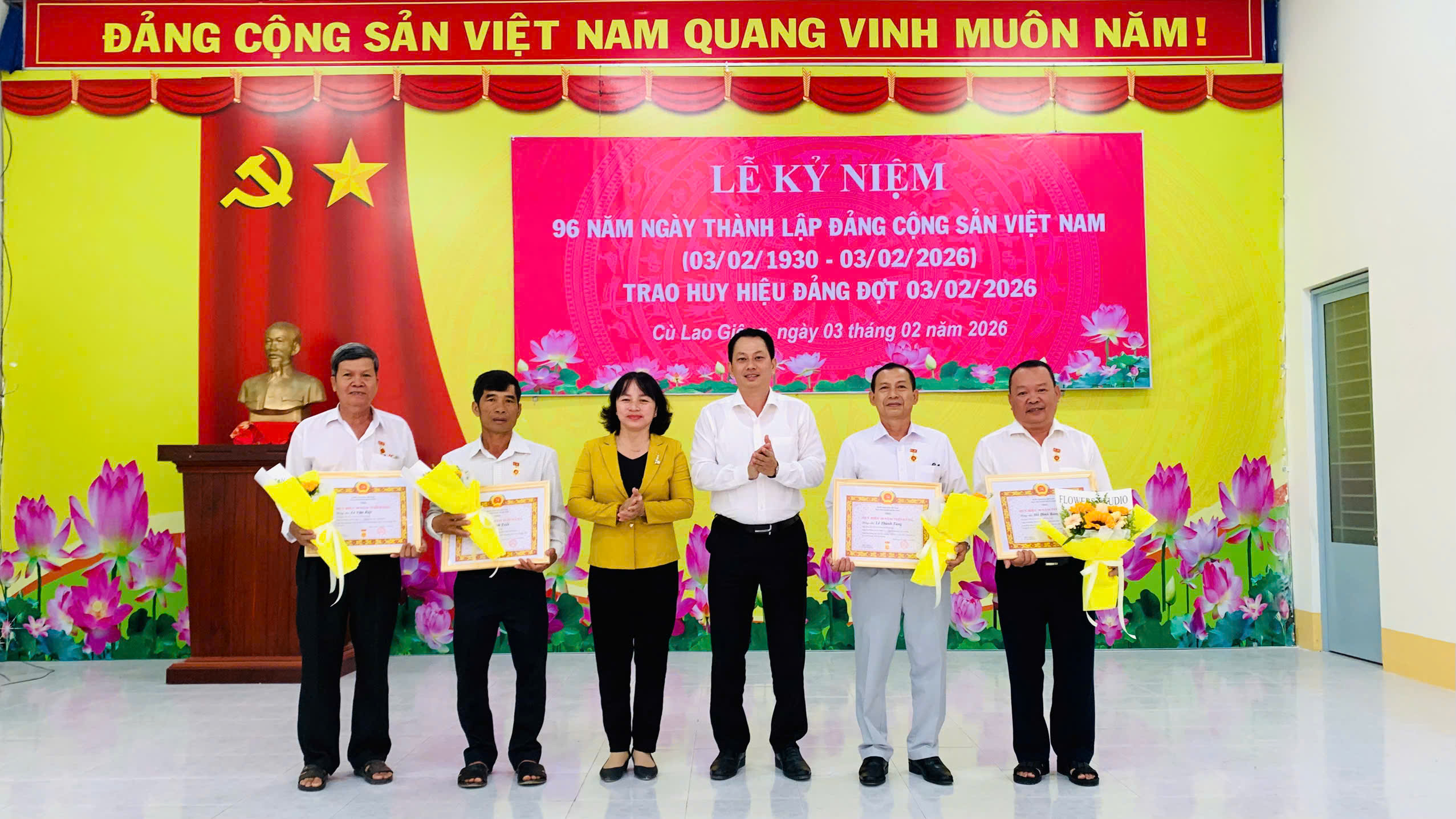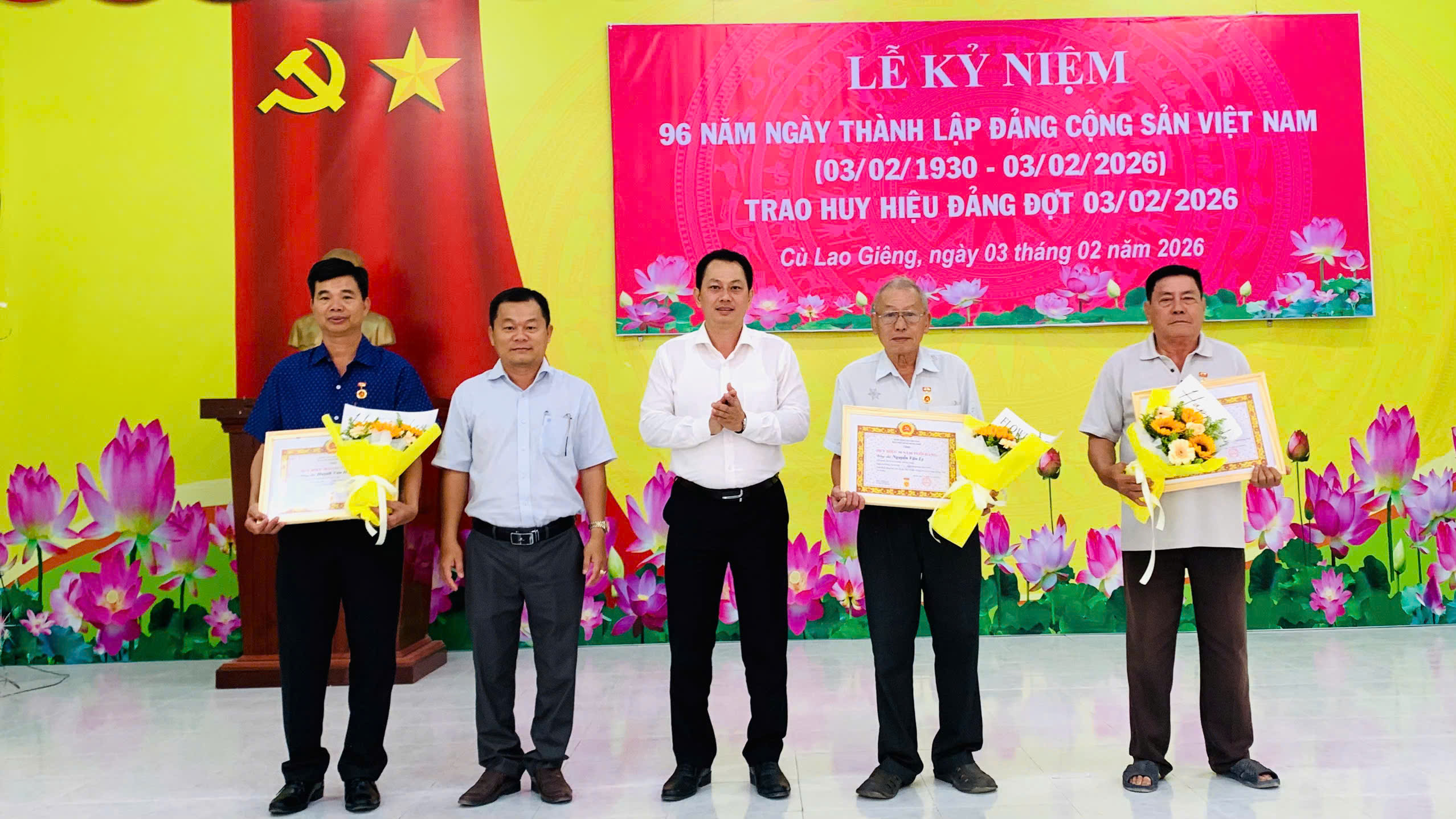 Tại buổi lễ, Ban Thường vụ Đảng ủy xã đã trao Huy hiệu Đảng đợt 3/2 cho 7 đảng viên cao niên tuổi Đảng nhận Huy hiệu 30 năm tuổi Đảng. Đồng thời, các đại biểu đã cùng nhau ôn lại kỷ niệm 96 năm Ngày thành lập Đảng Cộng sản Việt Nam (3/2/1930 - 3/2/2026).