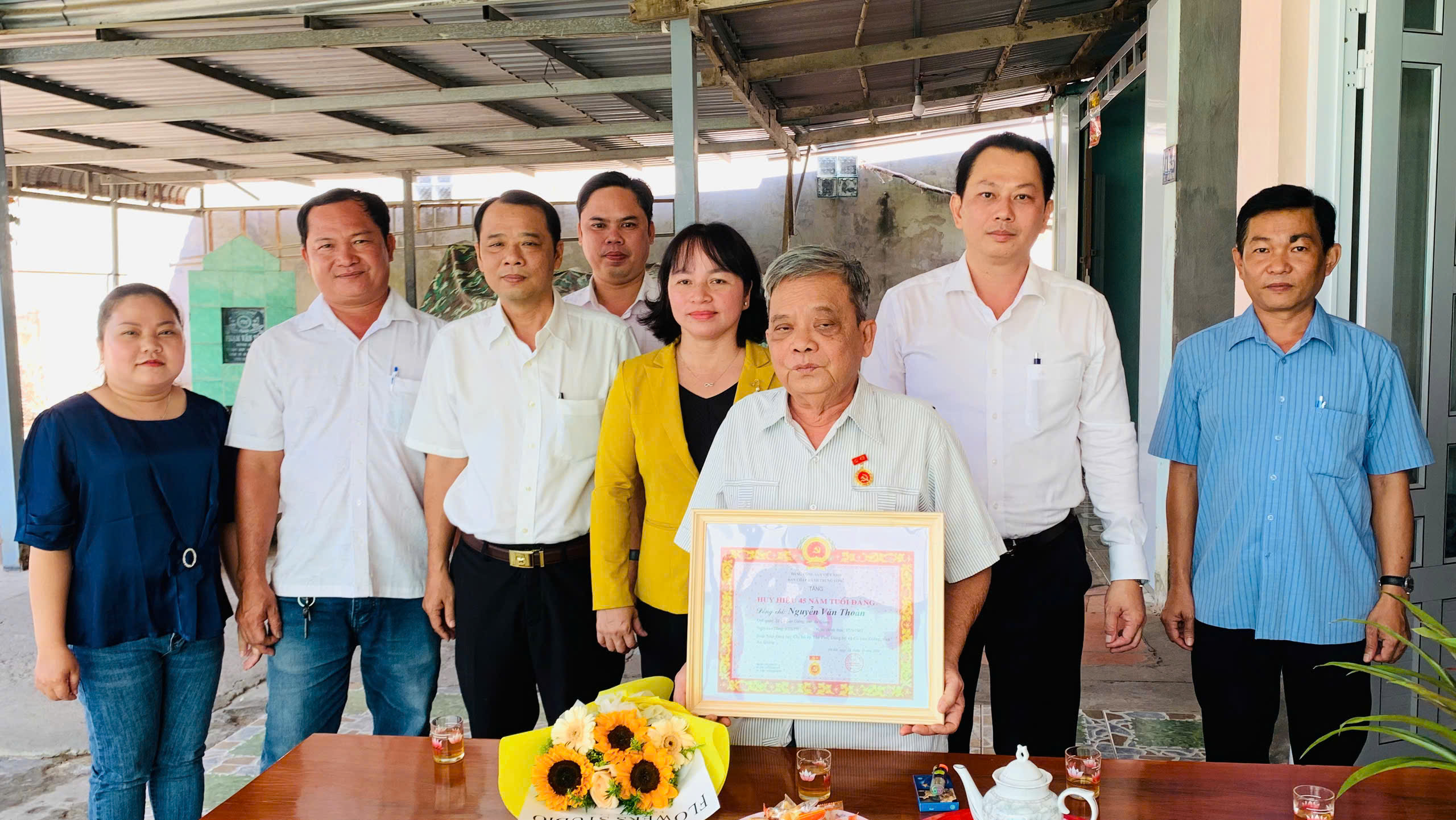 Sau buổi lễ, đồng chí Võ Minh Nâng – Bí thư Đảng ủy, Chủ tịch HĐND xã Cù Lao Giêng làm Trưởng đoàn đã đến thăm và trao tặng Huy hiệu 45 năm tuổi Đảng cho đồng chí Nguyễn Văn Thoàn – Nguyên Chỉ huy Trưởng Ban Chỉ huy Quân sự huyện Chợ Mới (cũ). Tại đây, đồng chí cùng với các thành viên trong đoàn đã ân cần thăm hỏi sức khoẻ và chúc mừng đồng chí nhận Huy hiệu 45 tuổi Đảng. Đồng thời, thông tin tình hình phát triển kinh tế - xã hội xã năm 2025 và nhiệm vụ trọng tâm 2026. Mong muốn đồng chí mãi là tấm gương sáng cho thế hệ trẻ học tập noi theo, vận động con cháu tham gia các hoạt động từ thiện xã hội, cùng với Đảng, chính quyền xây dựng xã nhà ngày càng phát triển./.