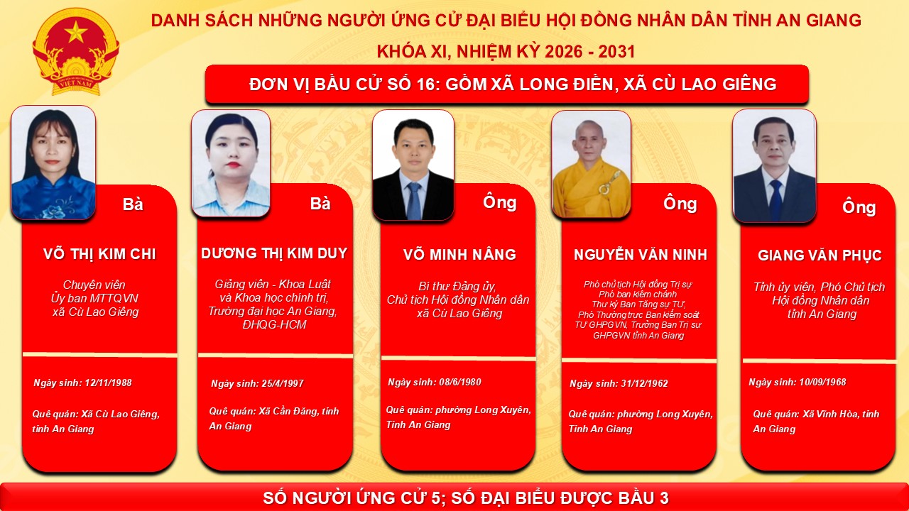 Danh sách những người ứng cử đại biều HĐND tỉnh An Giang, khóa XI, nhiệm kỳ 2026-2031 đơn vị bầu cử số 16 gồm xã Long Điền, xã Cù Lao Giêng