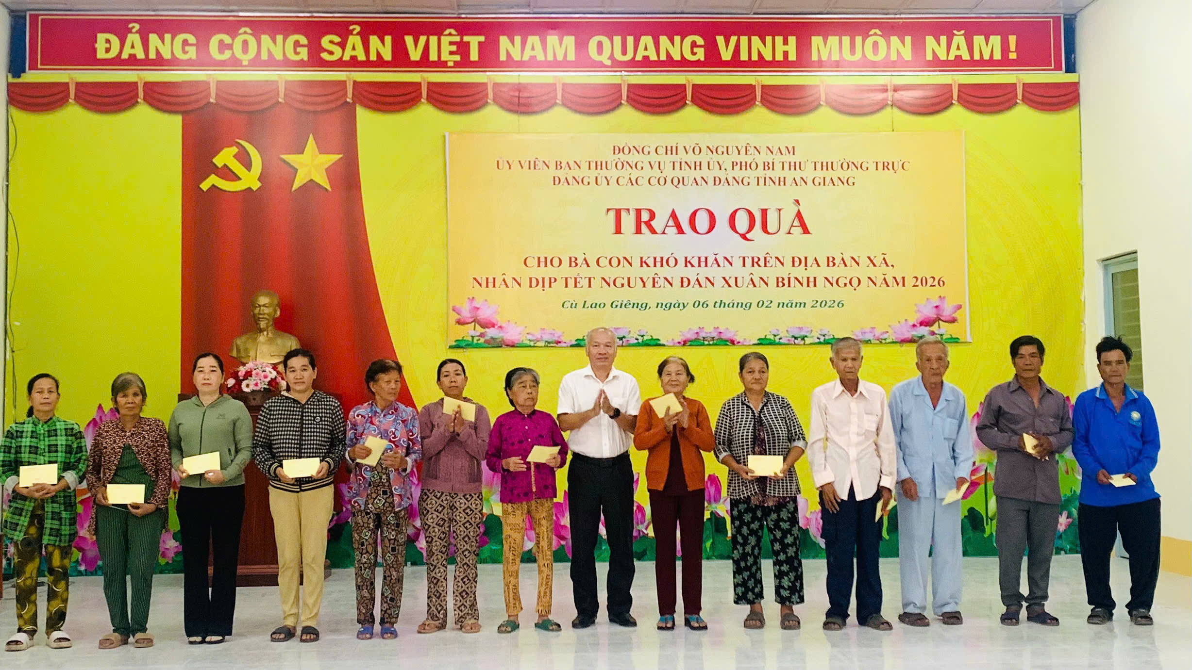 Nhằm tạo điều kiện cho hộ dân khó khăn vui xuân đón Tết Nguyên đán Bính Ngọ 2026 ấm áp, ngày 6/2, đồng chí Võ Nguyên Nam - UVBTV Tỉnh ủy, Phó Bí thư Thường trực Đảng ủy các cơ quan Đảng tỉnh An Giang đã đến xã Cù Lao Giêng trao 50 phần quà Tết cho hộ dân nghèo, cận nghèo trên địa bàn. Đến tham dự có đồng chí Võ Minh Nâng - Bí thư Đảng uỷ, Chủ tịch HĐND xã.