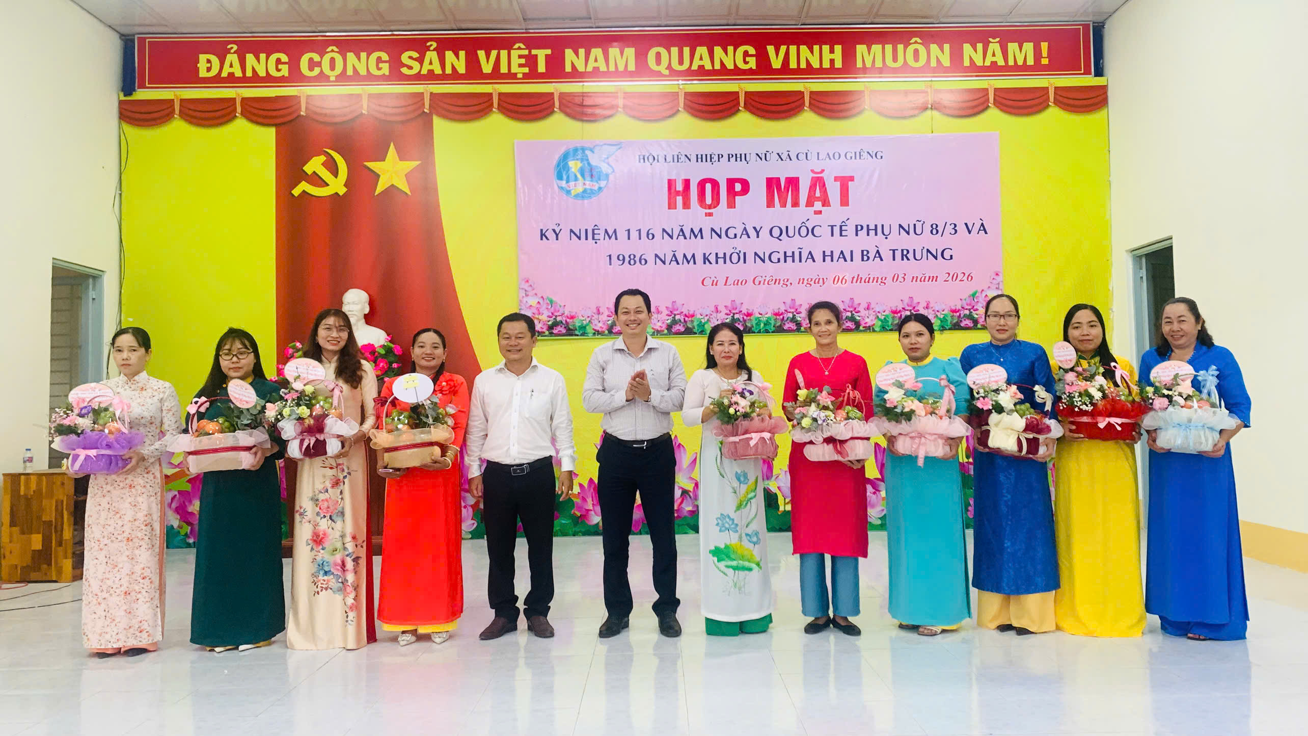 Chiều ngày 6/3/2026, Ban Thường vụ Hội LHPN xã Cù Lao Giêng long trọng tổ chức họp mặt kỷ niệm 116 năm ngày Quốc tế Phụ nữ (8/3/1910 - 8/3/2026) và 1986 năm khởi nghĩa Hai Bà Trưng. Đồng chí Võ Minh Nâng – Bí thư Đảng ủy, Chủ tịch HĐND xã; đồng chí Đỗ Minh Trí – Phó Bí thư Đảng ủy, Chủ tịch UBND xã đã đến dự.