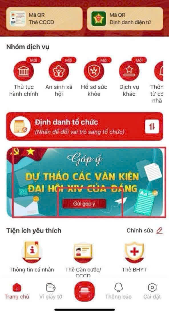 Tại giao diện chính, chọn mục “Góp ý dự thảo các Văn kiện Đại hội XIV của Đảng” (hiển thị ngay trang chủ, nếu không thấy có thể lướt qua để tìm).