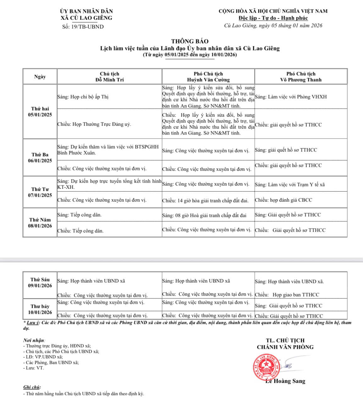 Lịch làm việc của lãnh đạo của UBND xã Cù Lao Giêng