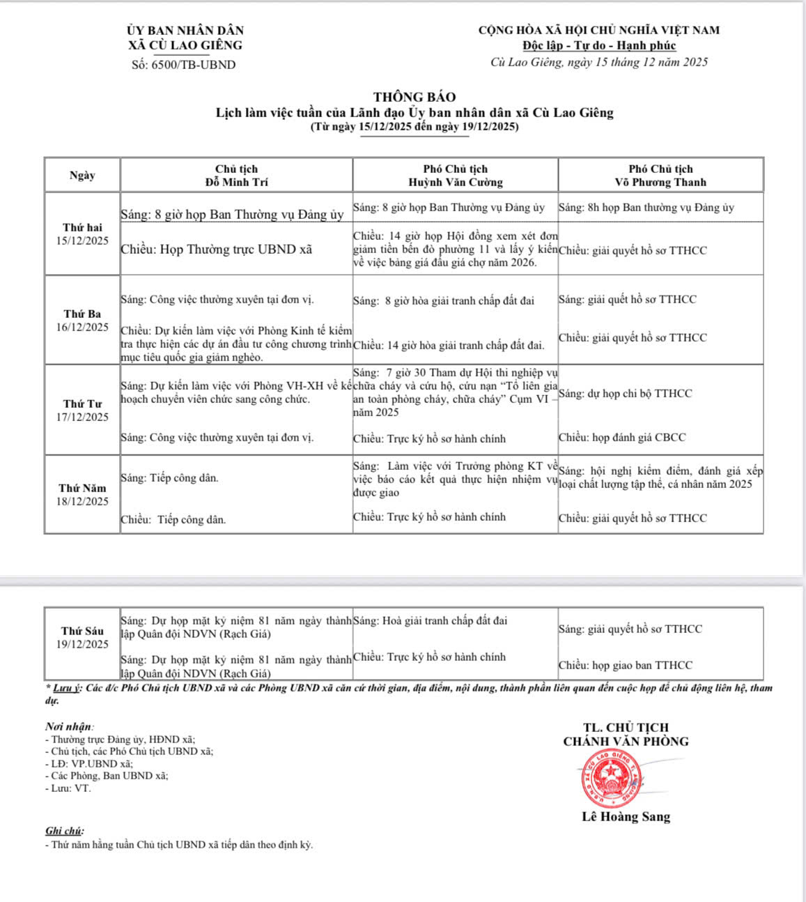 Thông báo lịch làm việc đơn vị xã Cù Lao Giêng