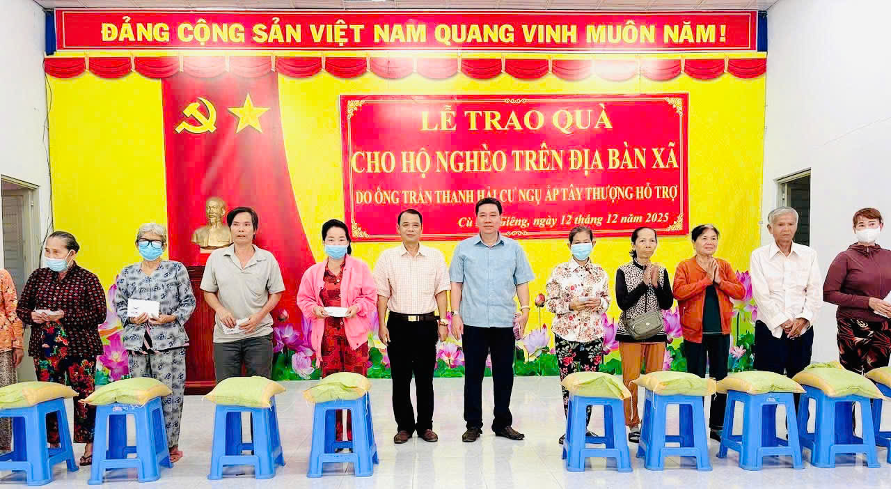 Nhằm chia sẻ khó khăn với hộ nghèo. Sáng ngày 12/12/2025, Uỷ ban MTTQ Việt Nam xã Cù Lao Giêng (tỉnh An Giang) tổ chức lễ trao quà cho 100 hộ nghèo trên địa bàn xã. Tham dự có đồng chí Trần Hữu Tín - Trưởng ban xây dựng Đảng, bà Trần Phan Như Ý - Chủ tịch MTTQ Việt Nam xã, ông Trần Thanh Hải - Mạnh Thường quân ấp Tây Thượng, xã Cù Lao Giêng đơn vị nhà tài trợ.